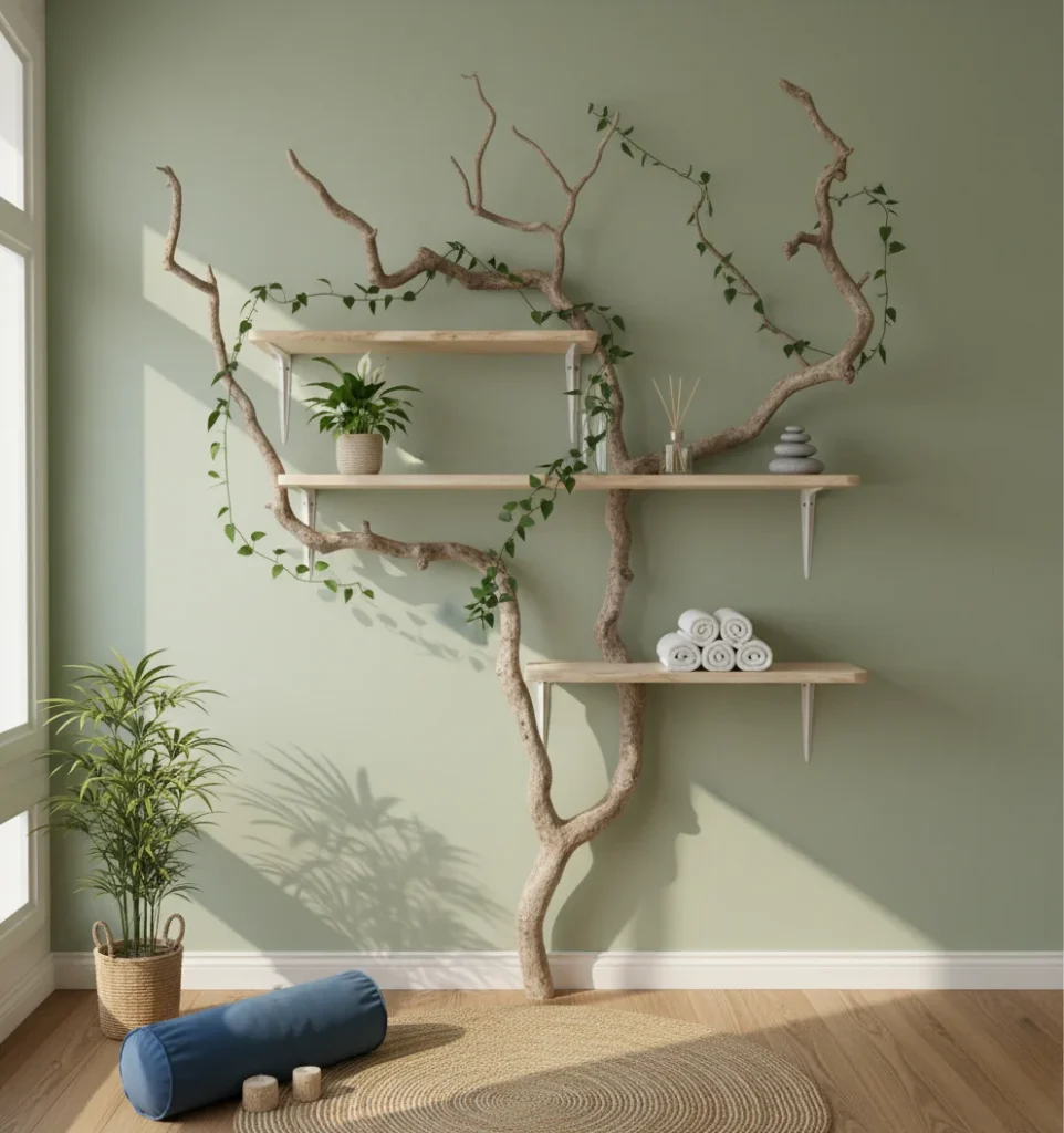 Vines weave along the trunk, softening the lines and adding a slow-living vibe. Use the tiers to stage candles, small plants, crystals, and a singing bowl for pre-practice rituals. Because the branch climbs across the wall, the display stretches vertically without crowding floor space.