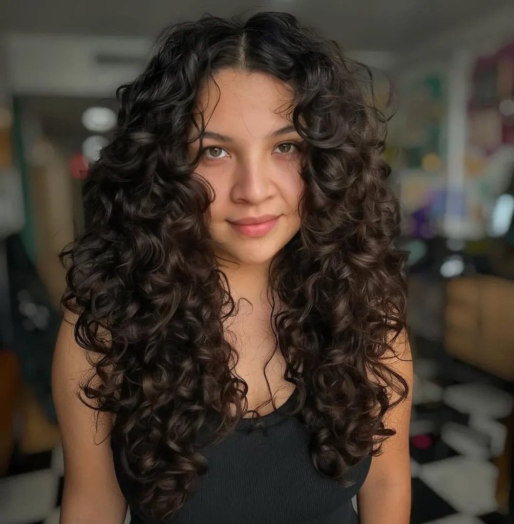 Subtle face framing pieces add softness, while the longer back layers keep the overall look balanced and flowing. Texture plays a key role here, as each curl is allowed to spring freely and show its natural pattern. Volume starts at the crown and melts downward, giving the hair an airy and effortless feel.