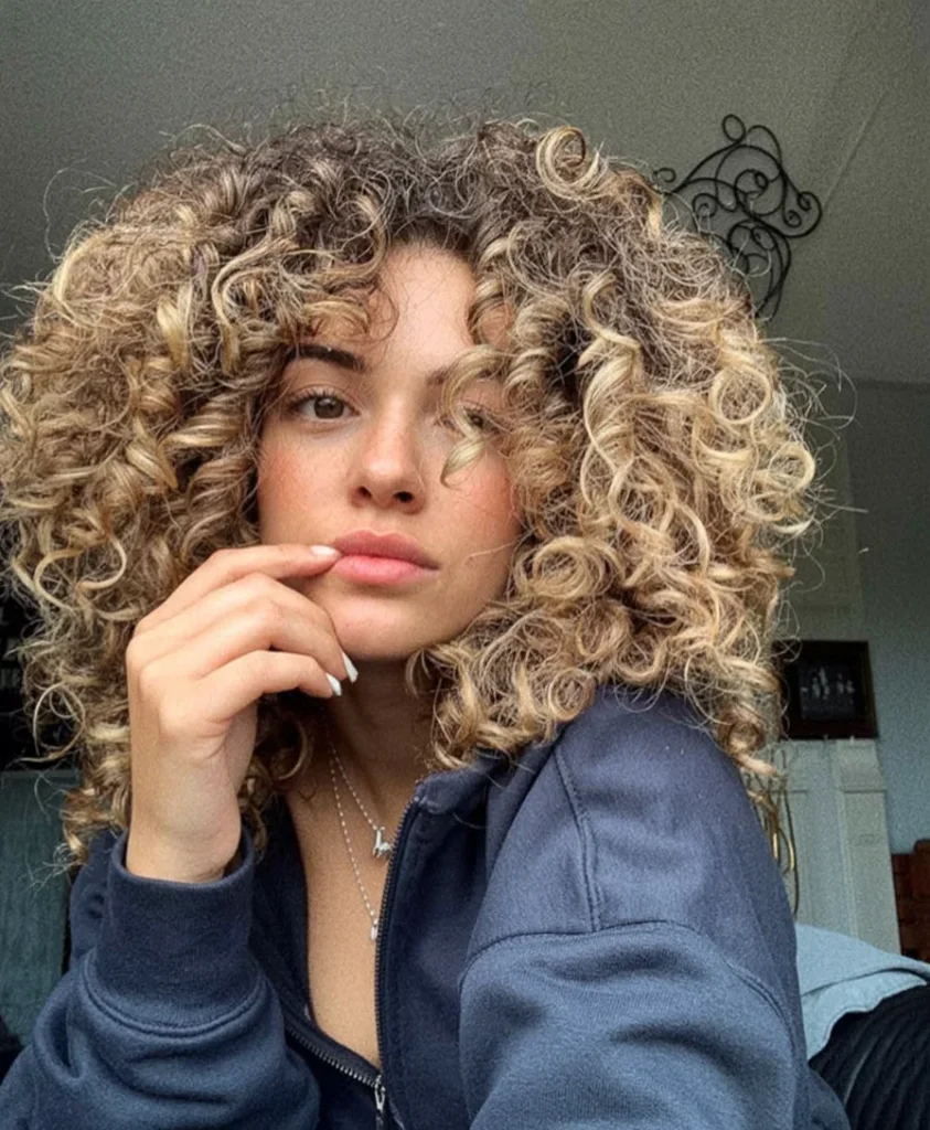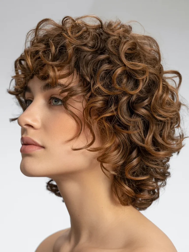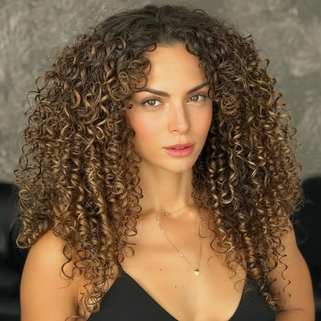 Warm highlights add depth and dimension, helping each curl catch the light. Styling feels simple with minimal effort, allowing curls to settle into their own pattern. This look suits anyone who loves movement, softness, and a timeless curly silhouette.