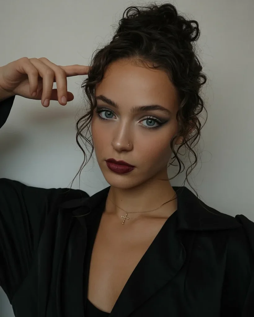 Wispy fringe pieces fall forward to highlight the eyes and cheekbones with ease. Texture looks defined yet touchable, giving the style a relaxed and modern feel. Each curl holds its own space, allowing the haircut to show depth and dimension.