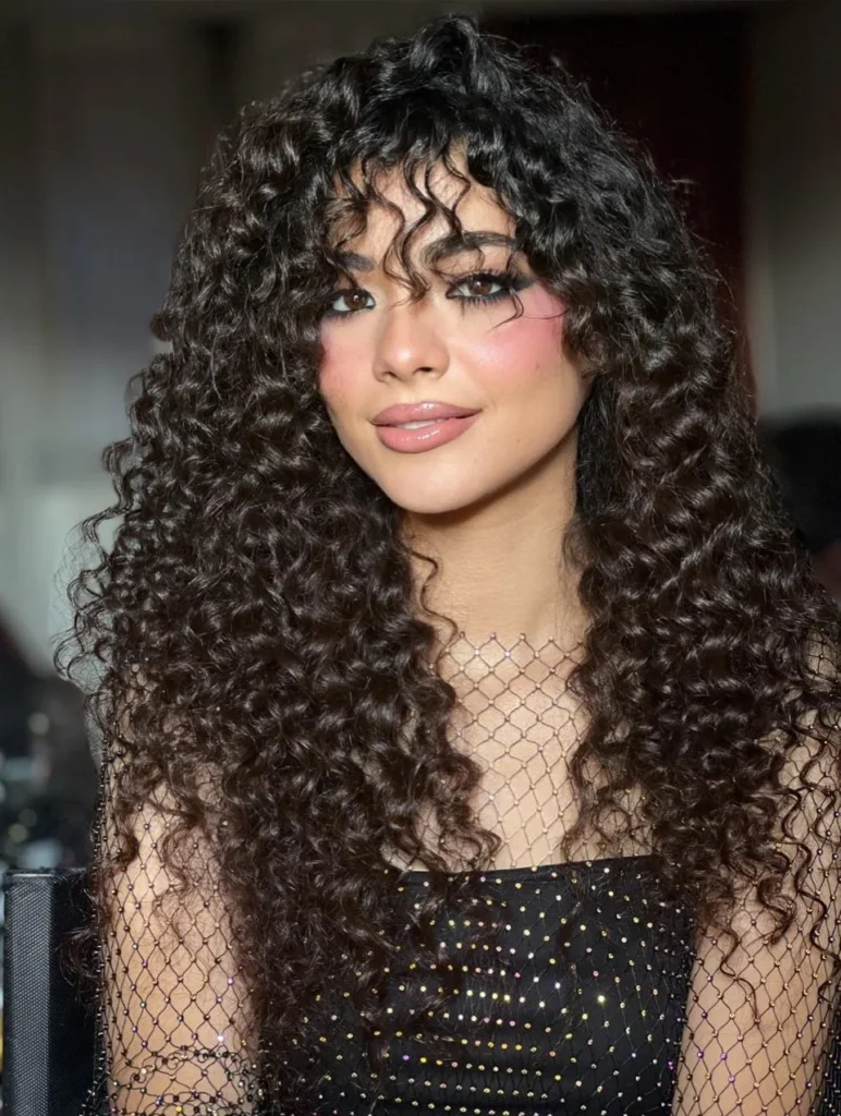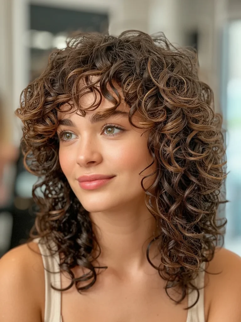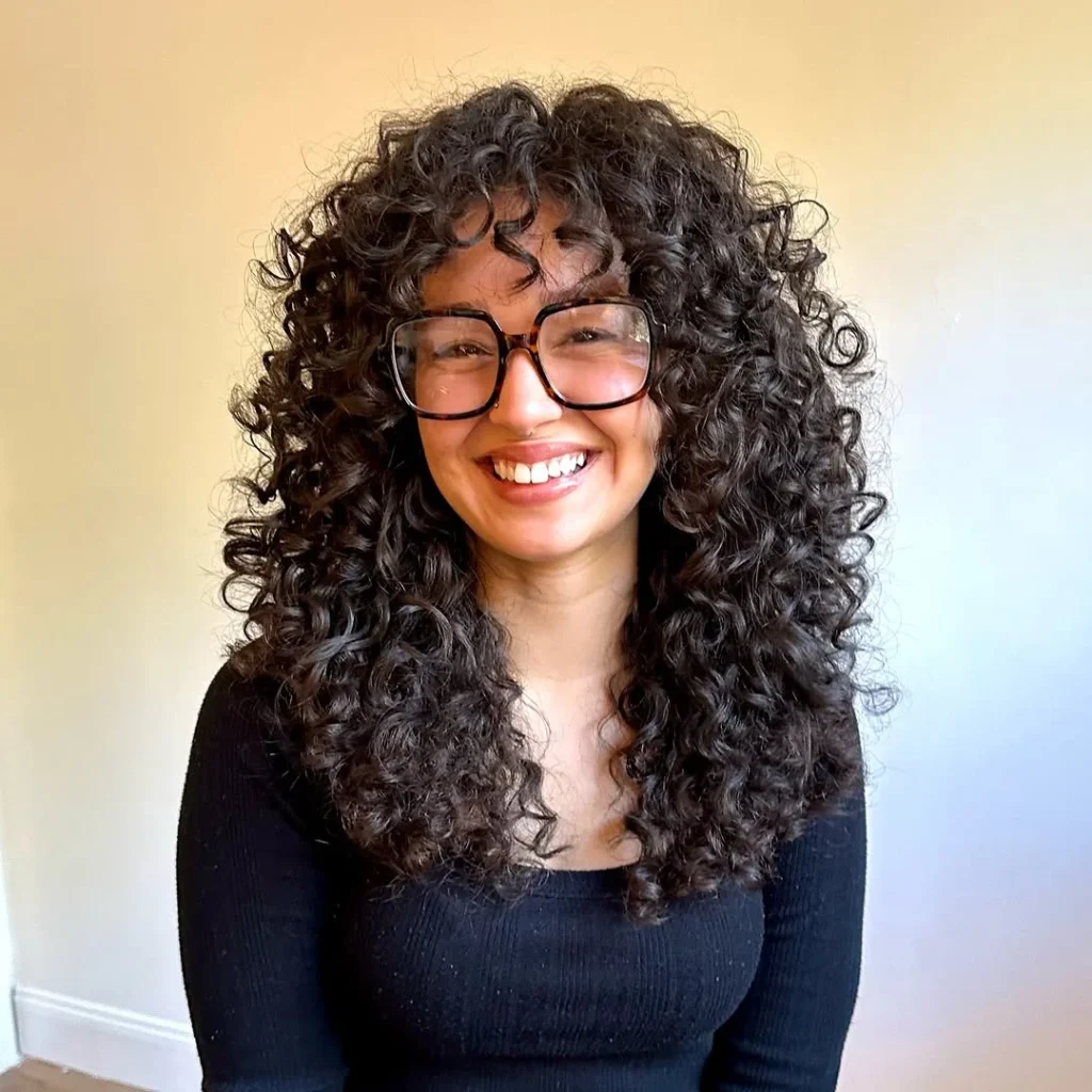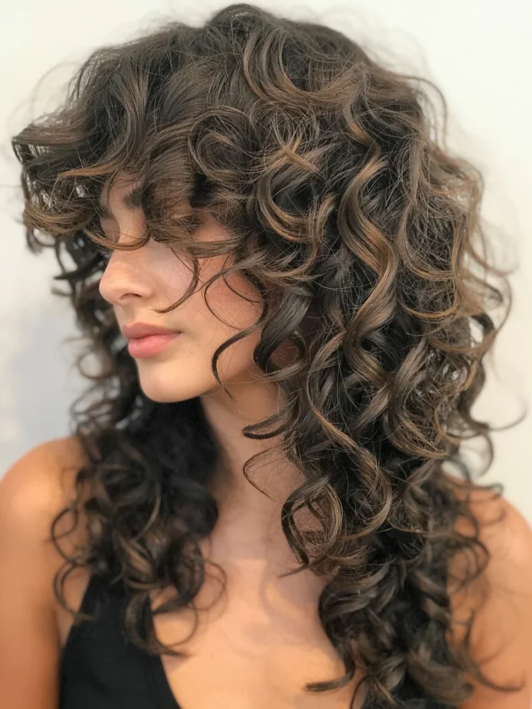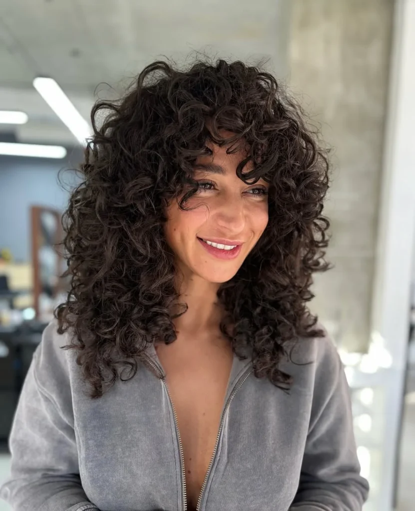 Wispy bangs blend smoothly into the layers, adding a youthful and relaxed finish. Texture stands out without looking heavy, making this style easy to wear every day. The cut enhances curl definition while keeping the overall look polished and natural.