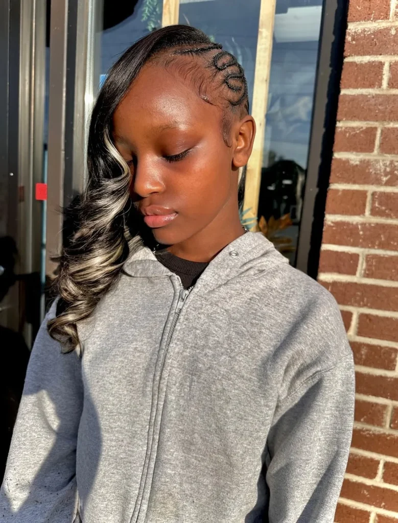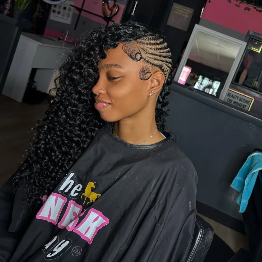 This hairstyle blends intricate side braids with loose, flowing curls for a look that’s both bold and carefree. The braids, with their unique spiraled design, run along the side of the head, adding structure and detail that contrasts beautifully with the softness of the curls.