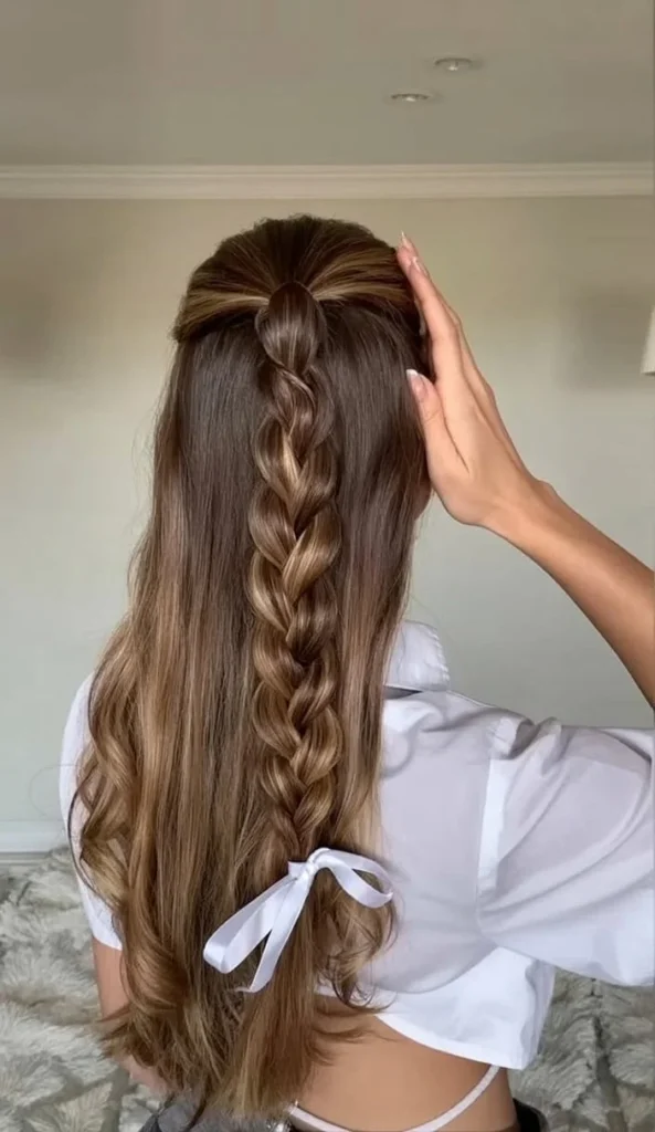 Subtle curls through the length give movement and texture, making the hair look full and alive. A simple ribbon tie at the end adds a romantic touch without overpowering the style. From the back, the look feels polished yet casual, suitable for daily wear or special moments.