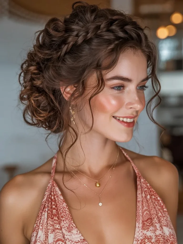 Paired with subtle jewelry and a flowy dress, this braided crown and curly hairstyle can transform any look into something graceful and chic. The overall feel is both fresh and timeless, making it a versatile option for any occasion.