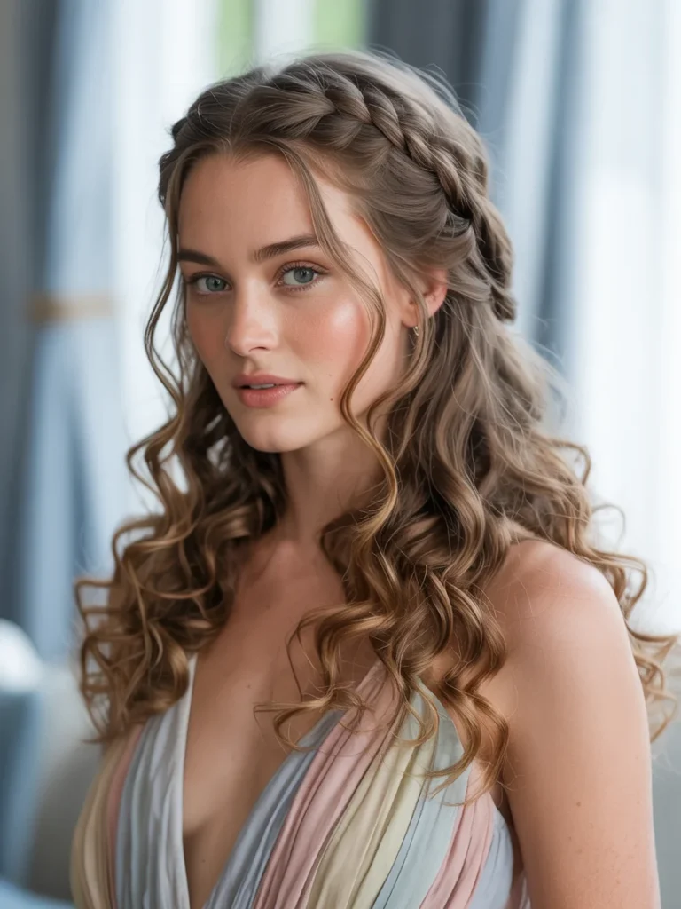 The relaxed curls and delicate braids highlight the natural beauty of the hair, offering a timeless and feminine look. Paired with a pastel-colored dress, the overall vibe is effortlessly chic and graceful.