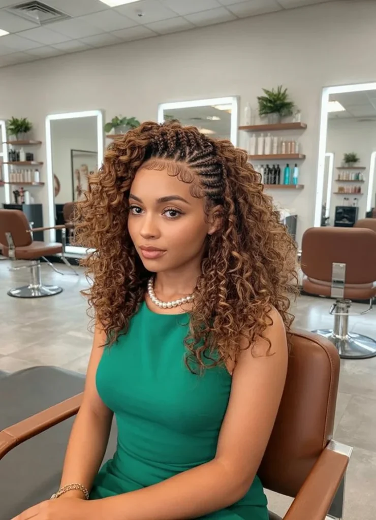 The curls are full of life, cascading down in waves that complement the sharp, defined braids. This look is both modern and feminine, making it a versatile choice for daily wear or special occasions.