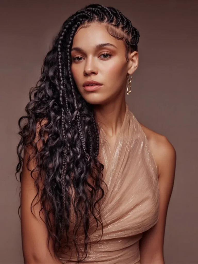 This hairstyle fuses bold braids with soft, defined curls, creating a striking and stylish look. The side-swept braids are intricately woven, forming tight, neat sections that flow into a beautifully curled texture.