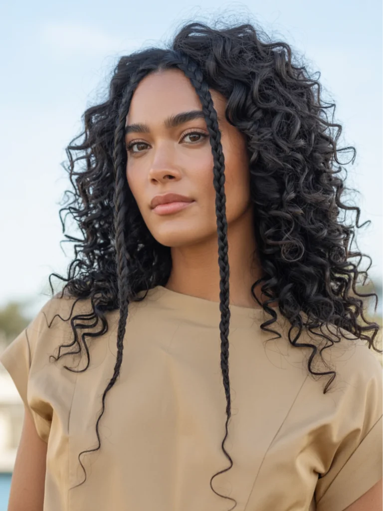 This hairstyle features two subtle, loose braids that frame the face, offering a structured yet relaxed vibe. The braids are neat but not tight, blending seamlessly with the natural curls that fall freely around the shoulders.