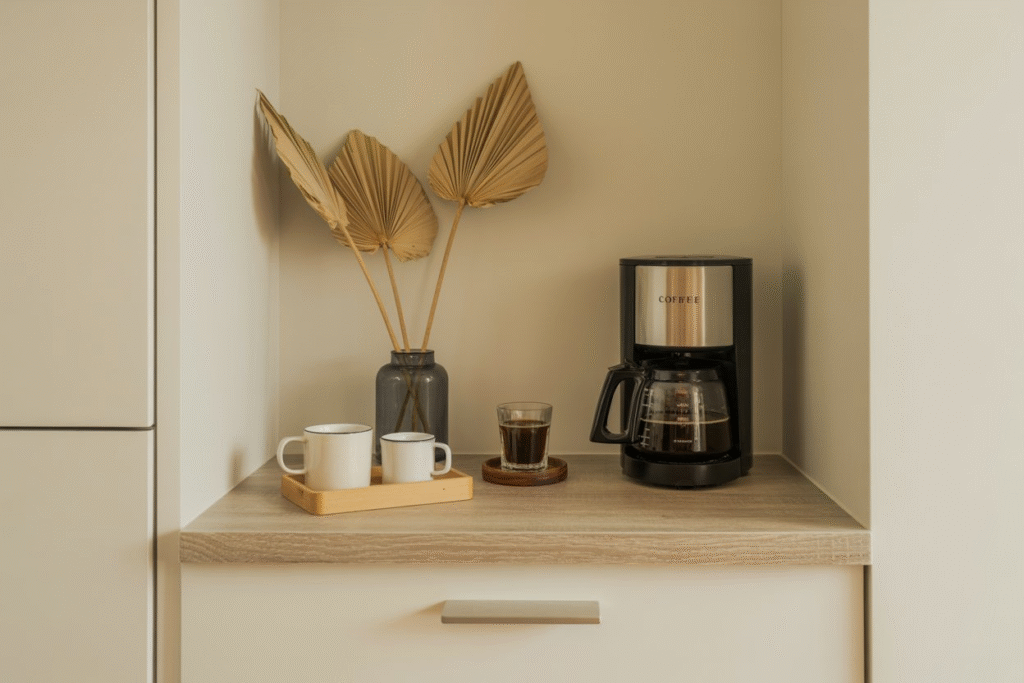 Even small spaces can have a dedicated coffee station. Transform a corner of your kitchen or living room into a coffee nook. A small table, single shelf, or compact cabinet can hold everything you need, coffee maker, mugs, sugar, and creamers, while ensuring a cozy and functional space.