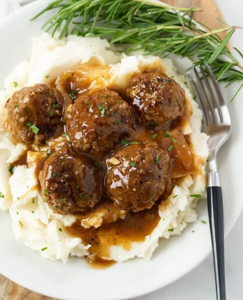 Cover and cook on low for 6 hours or on high for 3 hours until the meatballs are tender and the sauce thickens. Stir gently before serving. Spoon over creamy mashed potatoes, garnish with rosemary or parsley, and enjoy a warm, satisfying meal that everyone will love.
