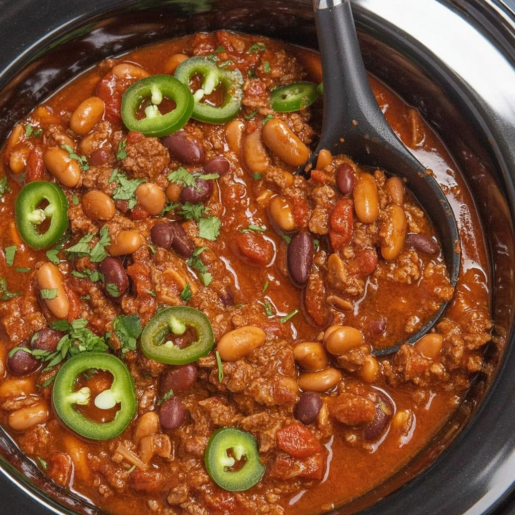 Brown the ground beef in a skillet until fully cooked, then drain the fat. Transfer it to the crock pot along with beans, tomatoes, onion, garlic, and all spices. Stir to combine and cover. Cook on low for 6–8 hours or high for 3–4 hours, allowing the flavors to develop beautifully. Stir occasionally to ensure even cooking. Before serving, taste and adjust seasoning as needed. Ladle into bowls, garnish with fresh jalapeños and cilantro, and serve warm with shredded cheese, sour cream, or cornbread on the side for a comforting family dinner.