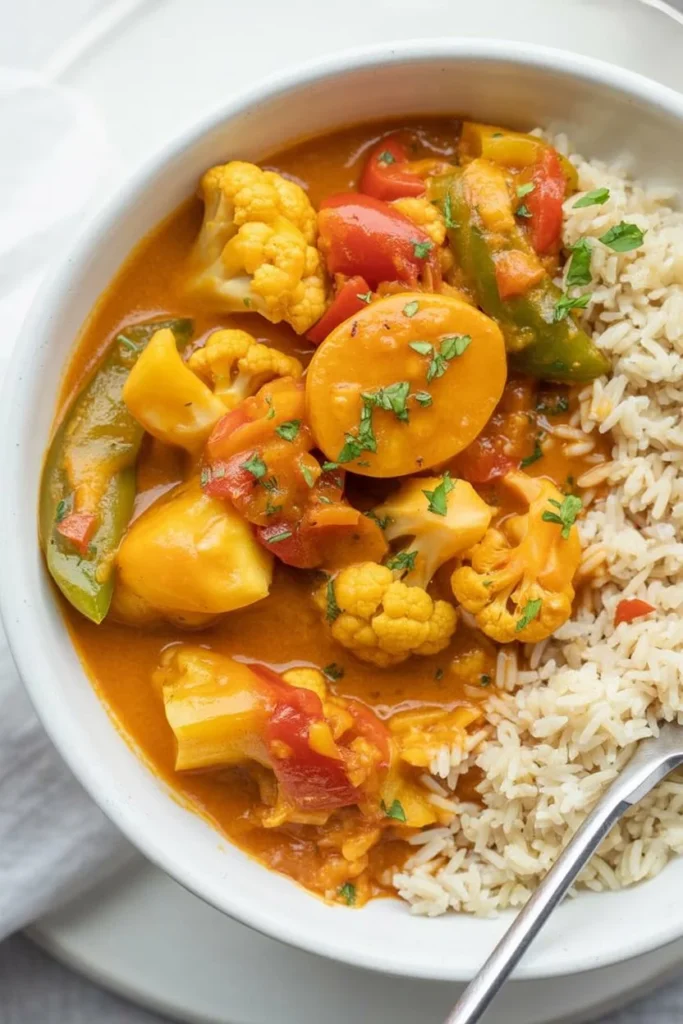 Cover and cook on low for 6–7 hours or on high for 3 hours until the vegetables are tender and the curry thickens slightly. Taste and adjust seasoning as needed. Serve warm over steamed rice or quinoa, and garnish with freshly chopped cilantro for a meal that’s simple, comforting, and full of flavor.
