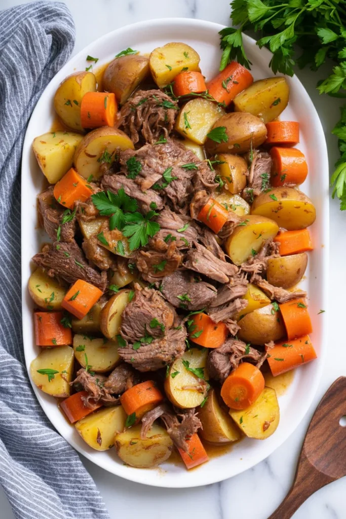 Cover and cook on low for 8–9 hours or high for 4–5 hours until the beef easily shreds with a fork. Remove the roast and vegetables from the pot, reserving the juices. Slice or shred the meat, drizzle with the savory broth, and garnish with fresh parsley. Serve warm with dinner rolls or over creamy mashed potatoes for a classic comfort meal.