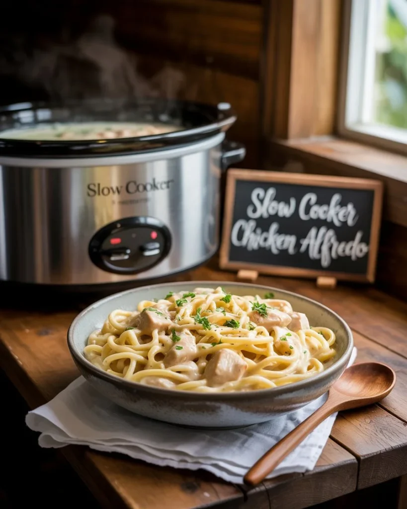 Creamy chicken Alfredo is surprisingly simple in a slow cooker. The pasta cooks right in the sauce for a rich, silky finish.