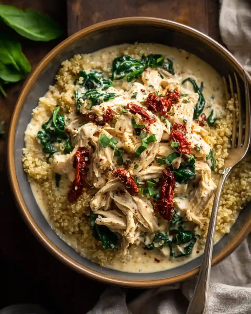 This cozy bowl combines tender shredded chicken, creamy garlic sauce, spinach, and sun-dried tomatoes served over fluffy quinoa for a comforting yet wholesome meal.