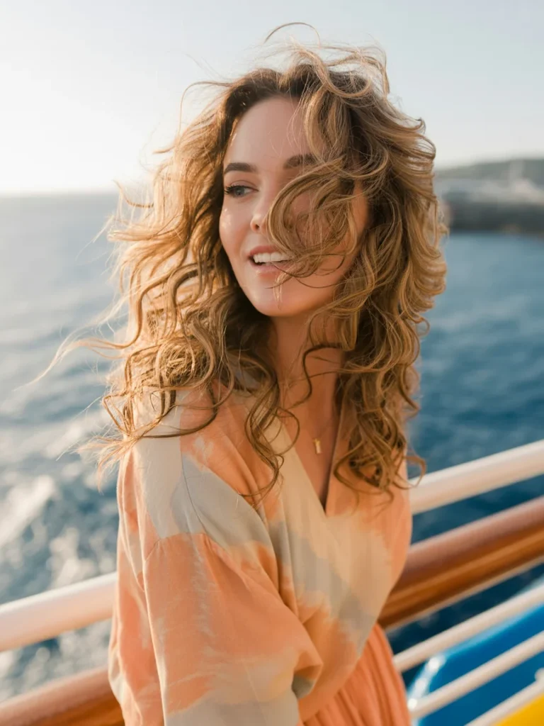 This hairstyle exudes a breezy, laid-back charm, perfect for days spent exploring the deck or enjoying the sea breeze. The soft, tousled curls add volume and texture while keeping things natural and carefree. Whether you’re enjoying a leisurely stroll along the cruise ship or sipping cocktails at sunset, this style complements both casual and semi-formal looks.