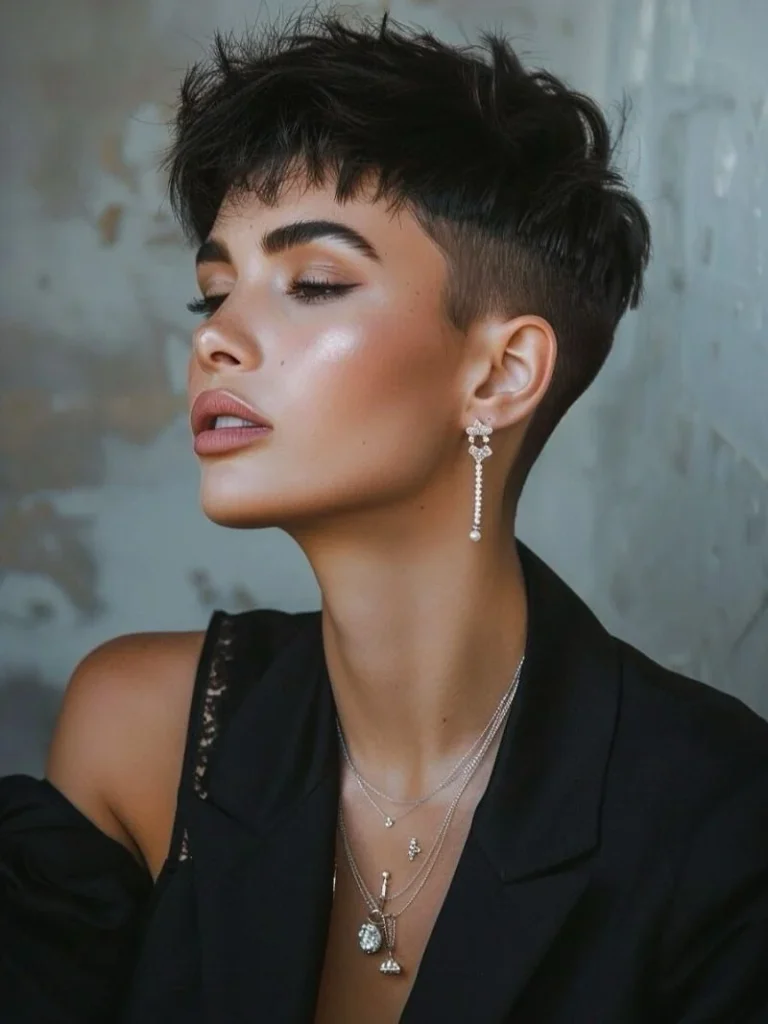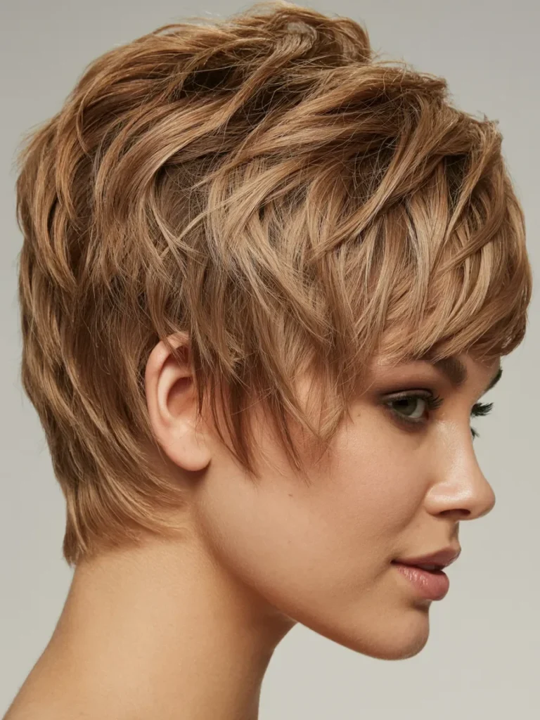 This textured pixie cut is a bold choice among cute short hair styles for women, blending soft volume on top with closely tapered sides for a sharp yet feminine look. Tousled layers create movement and depth, giving the hair a lively finish that feels modern and expressive.