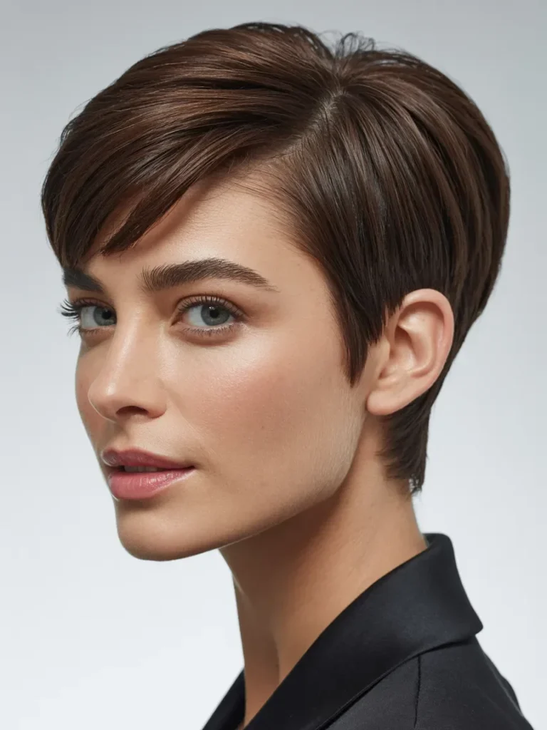 Among cute short hair styles for women, this layered side pixie instantly draws attention with its dramatic side sweep and soft feathered texture that frames the face beautifully. Gentle layers flow from the crown toward the cheek, creating natural movement that adds depth and highlights the eyes with a subtle yet confident touch.