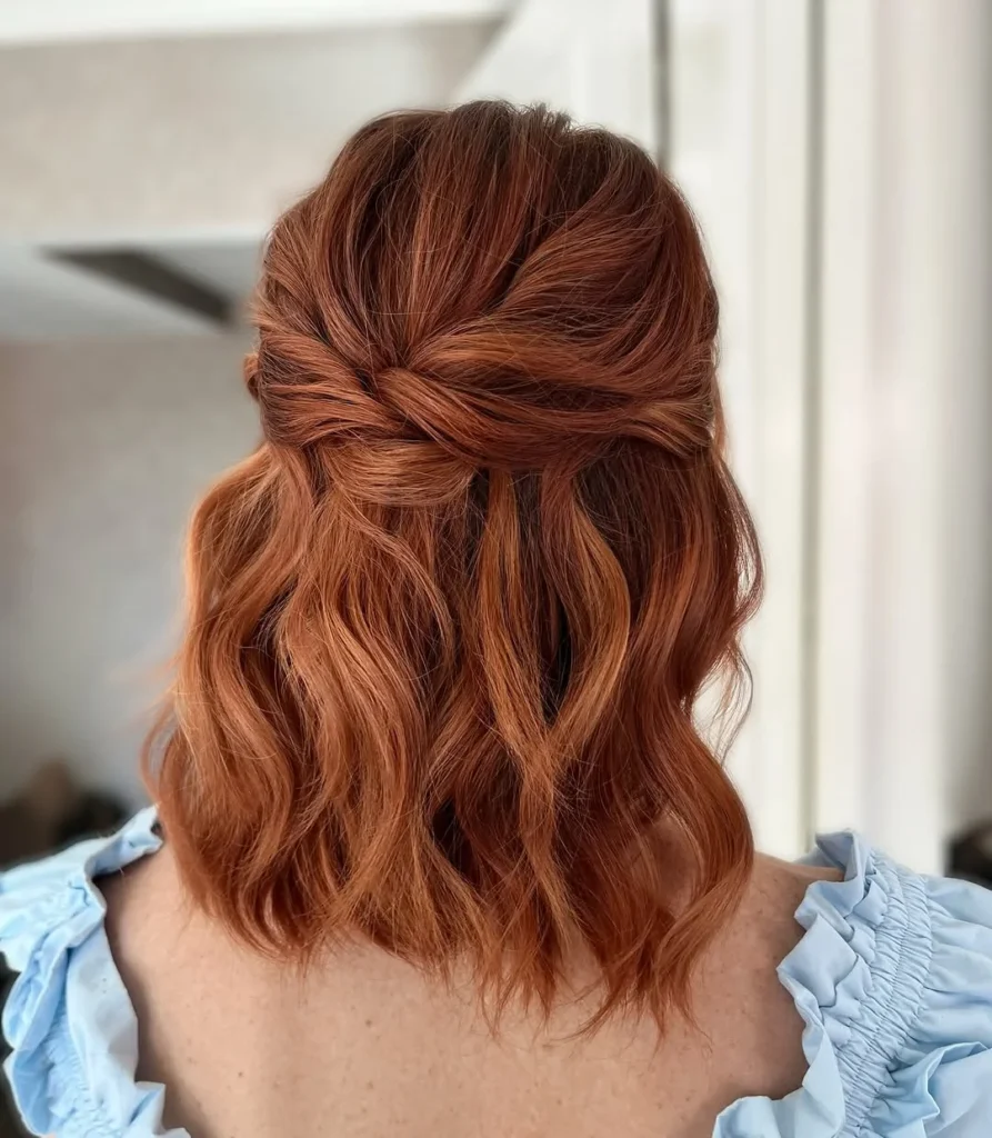 This twisted half up style brings a romantic touch to cute short hair styles for women who love soft texture and detail. Gentle waves fall to the shoulders while the top section is loosely twisted for added charm and dimension.