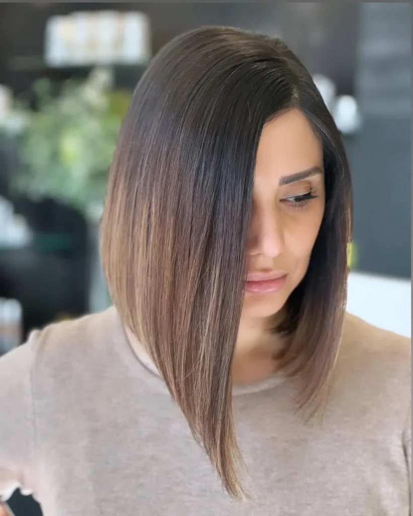 Deep brunette tones melt into lighter ends, adding dimension and making the cut look rich and modern. Smooth strands enhance the sharp angle while keeping the overall appearance polished and refined.