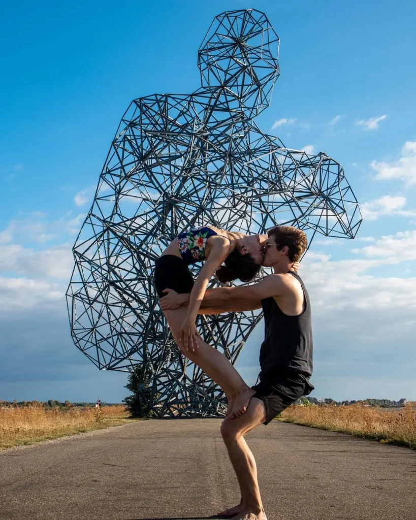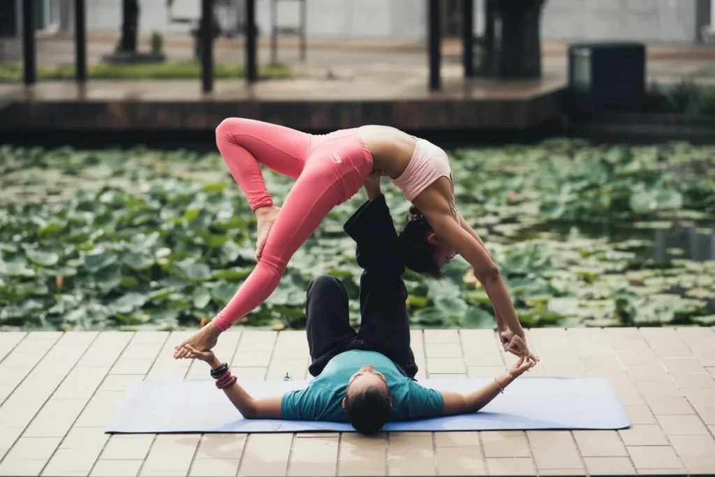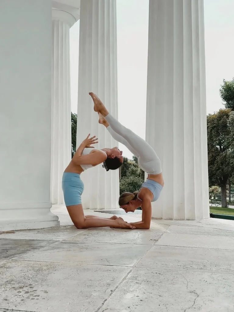 The partner on the ground provides the stability needed, while the person in the air works on flexibility and focus. It’s a beautiful demonstration of trust, synchronization, and mutual support, allowing both partners to push their physical limits together.