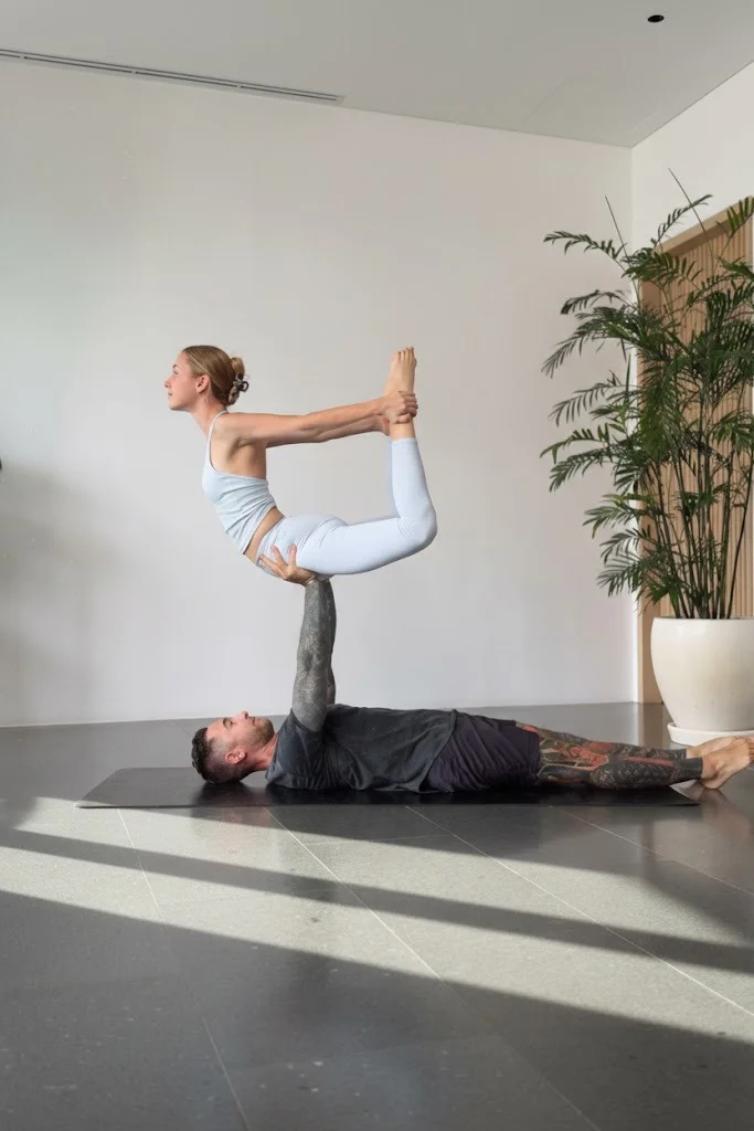 This pose requires both partners to engage their core and leg muscles for support. The person on the ground provides stability and control, while the one lifted must trust their partner and maintain their balance. It’s a powerful practice for building teamwork, flexibility, and connection between the partners.