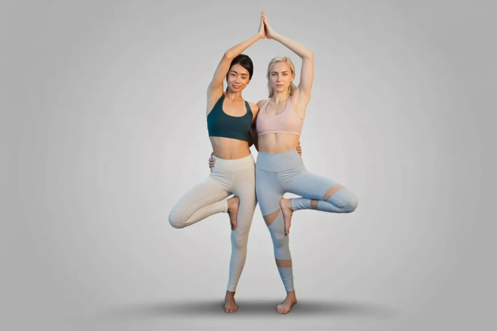 The partner tree pose is a beautiful demonstration of balance, focus, and connection. Both participants begin by standing on one leg, bringing the sole of the other foot to the inner thigh or calf. With hands joined overhead, they create a mirrored “V” shape, symbolizing the strength and harmony between them.