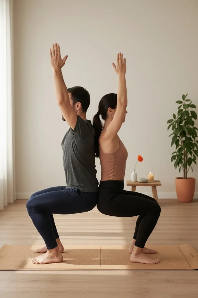 The partner chair pose is a wonderful duo yoga exercise that builds strength, balance, and teamwork. Both participants start by sitting back into a squat position, with their backs touching for support. With arms extended upward, they engage their core muscles to hold the posture while maintaining a steady breath.