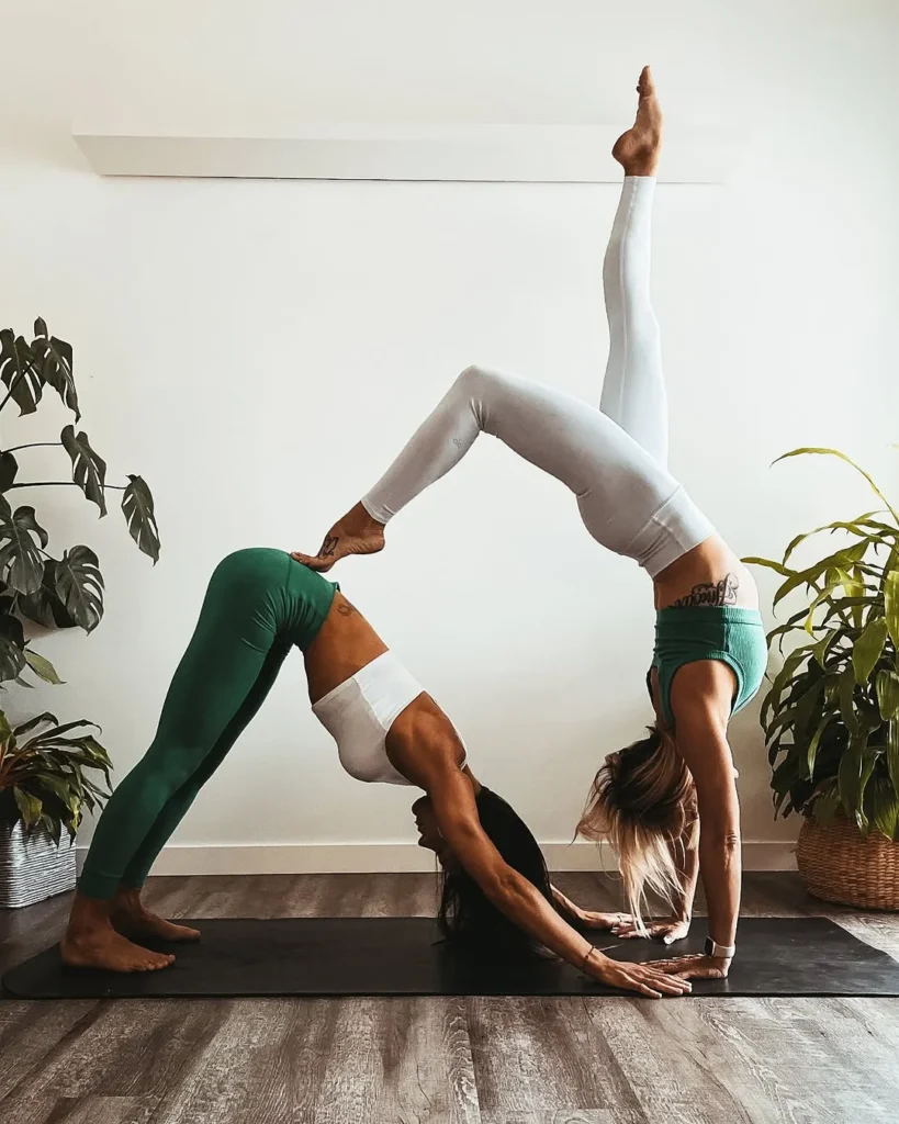 This duo yoga pose is a perfect blend of strength, flexibility, and teamwork. One partner lies on their back, lifting their feet to support the other, who balances upside down with their legs extended and arms reaching for the sky. This pose challenges both core and arm strength while improving balance and coordination.