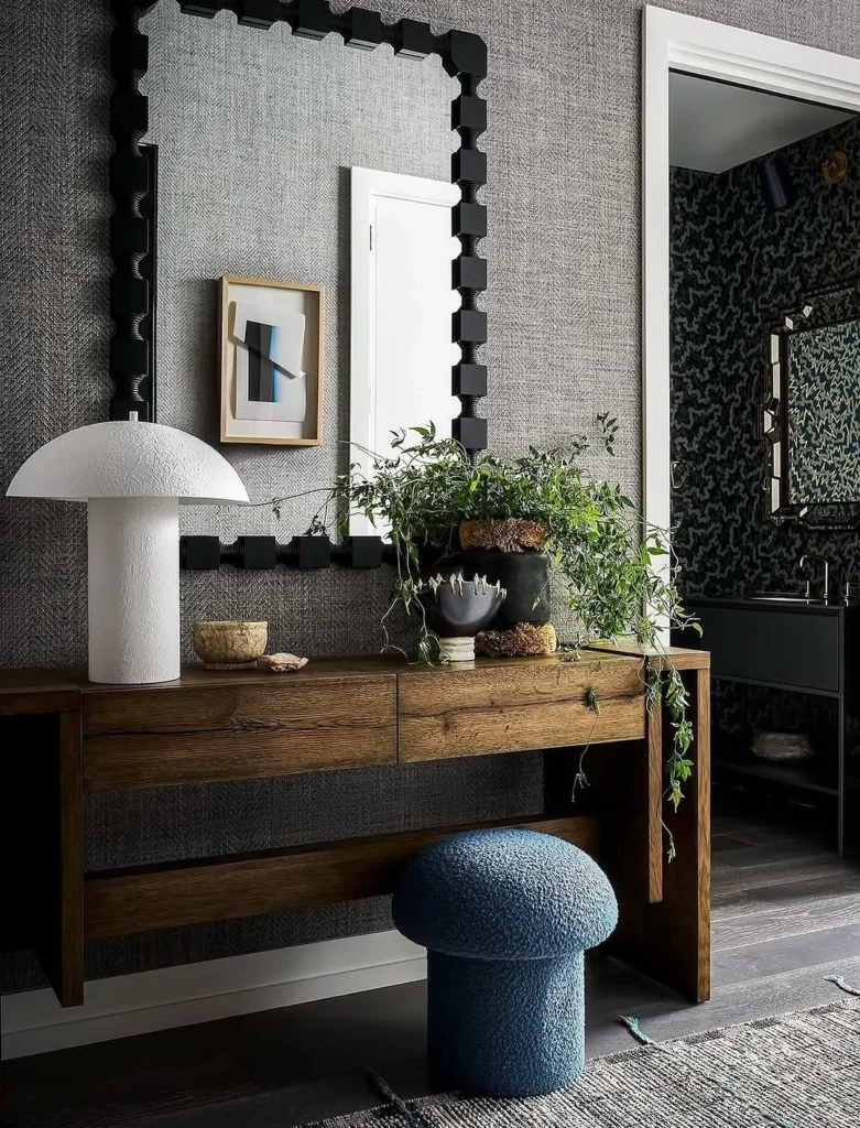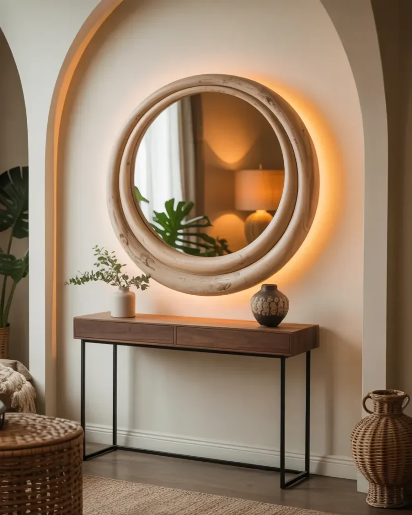 Positioned above a simple wooden console table, the mirror not only serves a functional purpose but also enhances the space visually. It reflects light, helping to create a brighter, more spacious feel in the entryway.