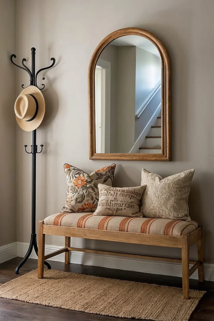 Above the wooden bench, the mirror not only serves as a functional piece for quick checks but also reflects natural light, making the space feel brighter and more open. It balances both form and function effortlessly.