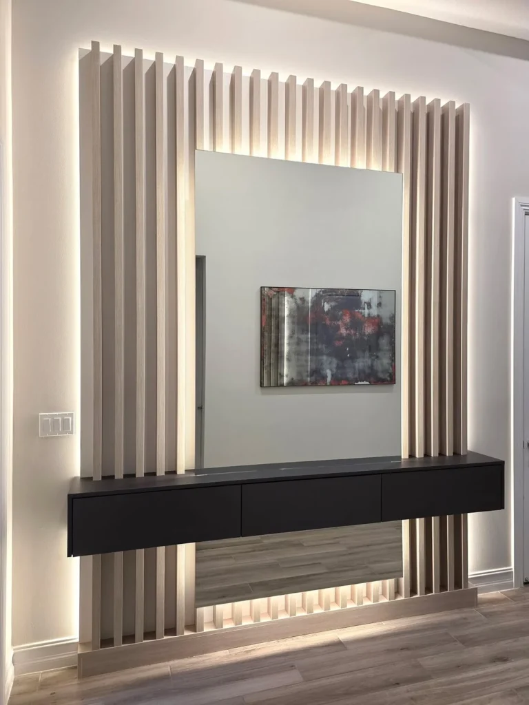 This striking mirror features a modern slatted frame with integrated lighting that creates a soft, ambient glow. The backlighting highlights the geometric design, enhancing both the mirror and the surrounding space.
