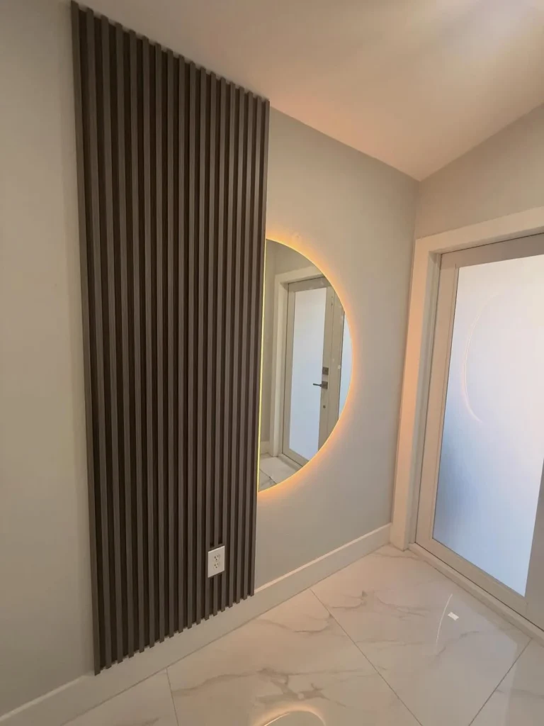 This sleek, round mirror with a unique backlit design offers both style and function. The clean lines of the dark, slatted wall accentuate the soft glow around the mirror, creating a modern, welcoming atmosphere in the entryway.