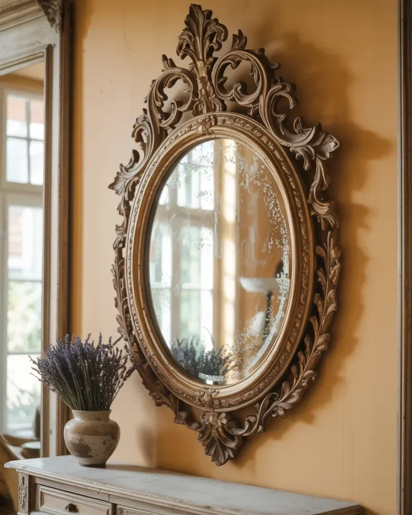 Its oval shape and the exquisite leaf motifs along the frame add a sophisticated touch, blending traditional elegance with a sense of opulence. The subtle aging of the mirror surface enhances the vintage appeal, giving it a characterful and authentic look.