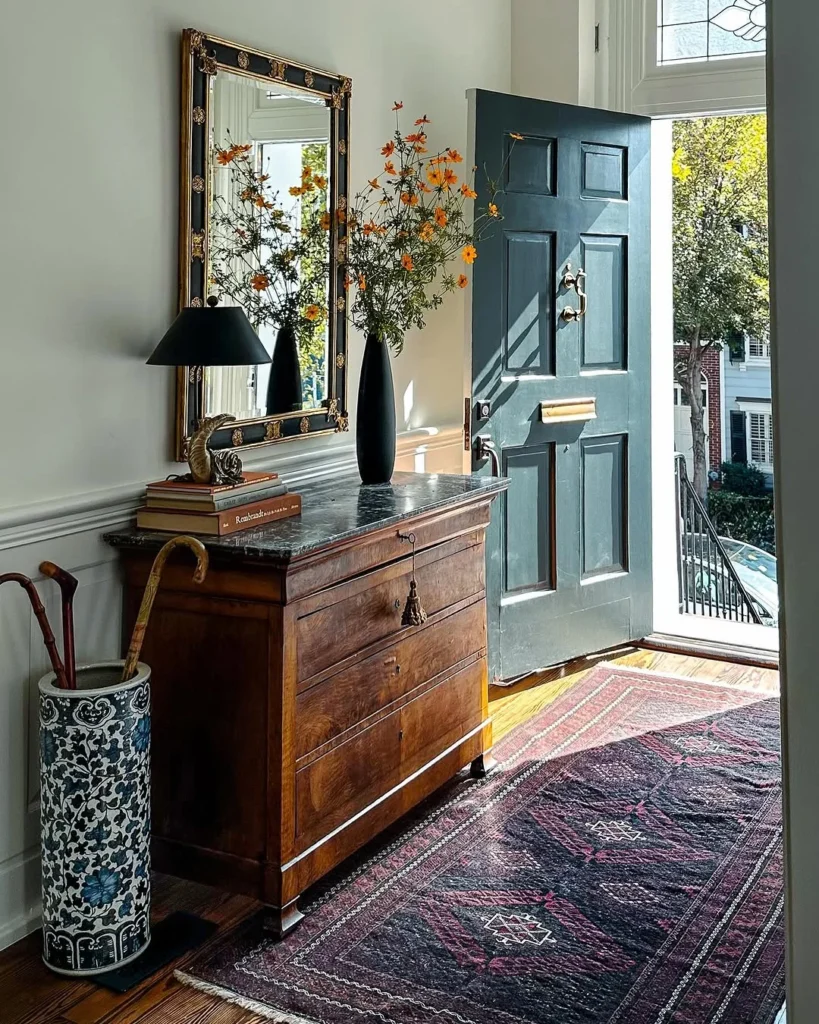 Its presence also amplifies the warmth of the natural light streaming in from the door, making your entryway feel more expansive. The combination of wood, metal, and floral accents brings nature and elegance together.