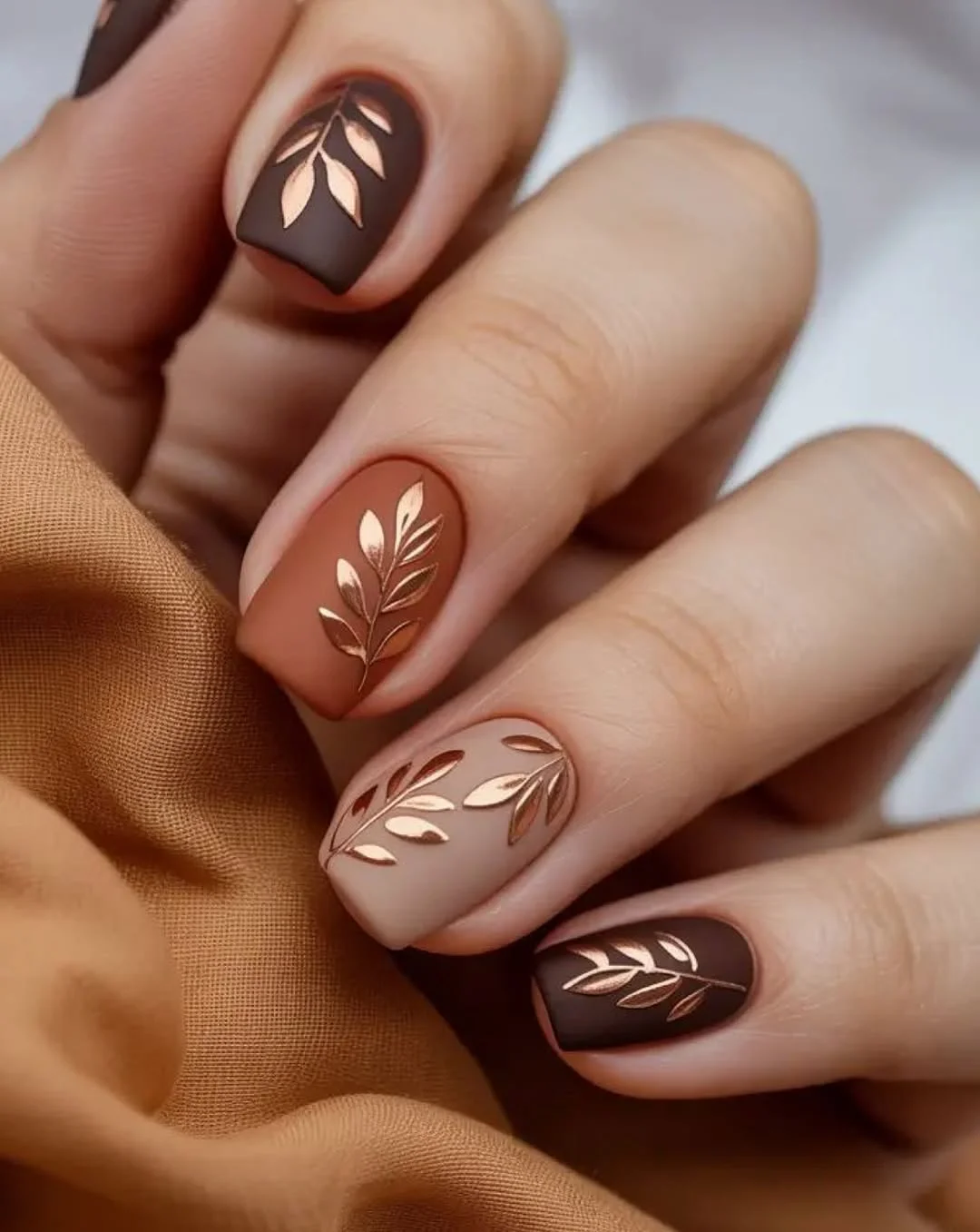 10. Matte Brown & Rose Gold Leaf Nail Art