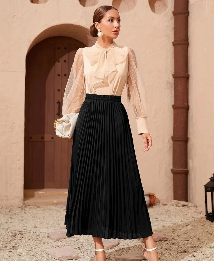 An elegant pleated skirt dinner ensemble brings a calm, polished charm to any classy evening. The soft beige blouse sets a graceful tone with its sheer sleeves and delicate bow, creating a look that feels both feminine and refined.