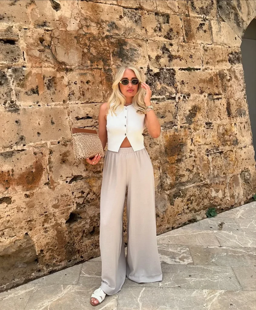 A chic wide-leg dinner set offers a classy yet relaxed approach to evening style. The crisp white sleeveless top brings a clean, tailored look, while its subtle front details add just enough charm. Flowy beige trousers soften the outfit, moving with ease and giving the whole look a graceful, effortless feel.