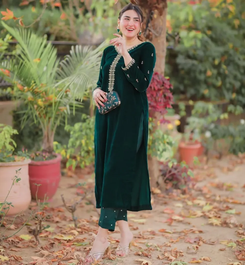 An emerald velvet embroidered dinner set brings a soft, regal charm to a classy evening look. The rich green fabric catches light beautifully, giving the outfit a warm, luxurious feel. Gold threadwork along the neckline and sleeves adds a graceful touch that feels both festive and refined.