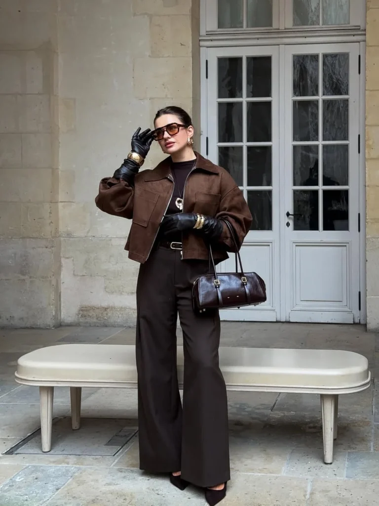 A glossy brown handbag ties everything together, offering both style and function. Oversized sunglasses give the final hint of attitude, creating a poised, effortless mood that suits high-end dinners. This look is for women who enjoy strength and softness working side by side.