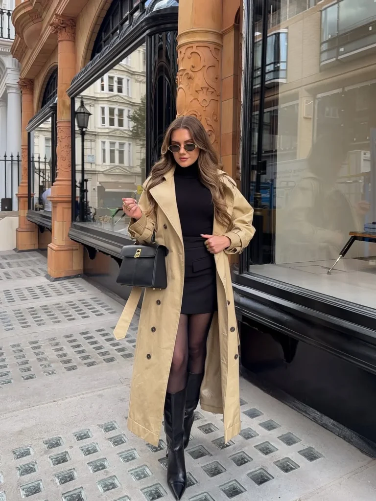 A classic trench coat dinner look blends confidence with timeless charm, making it a strong choice for a classy evening out. The long beige coat adds structure and effortless polish, creating a beautiful contrast against the sleek black turtleneck and mini skirt underneath.