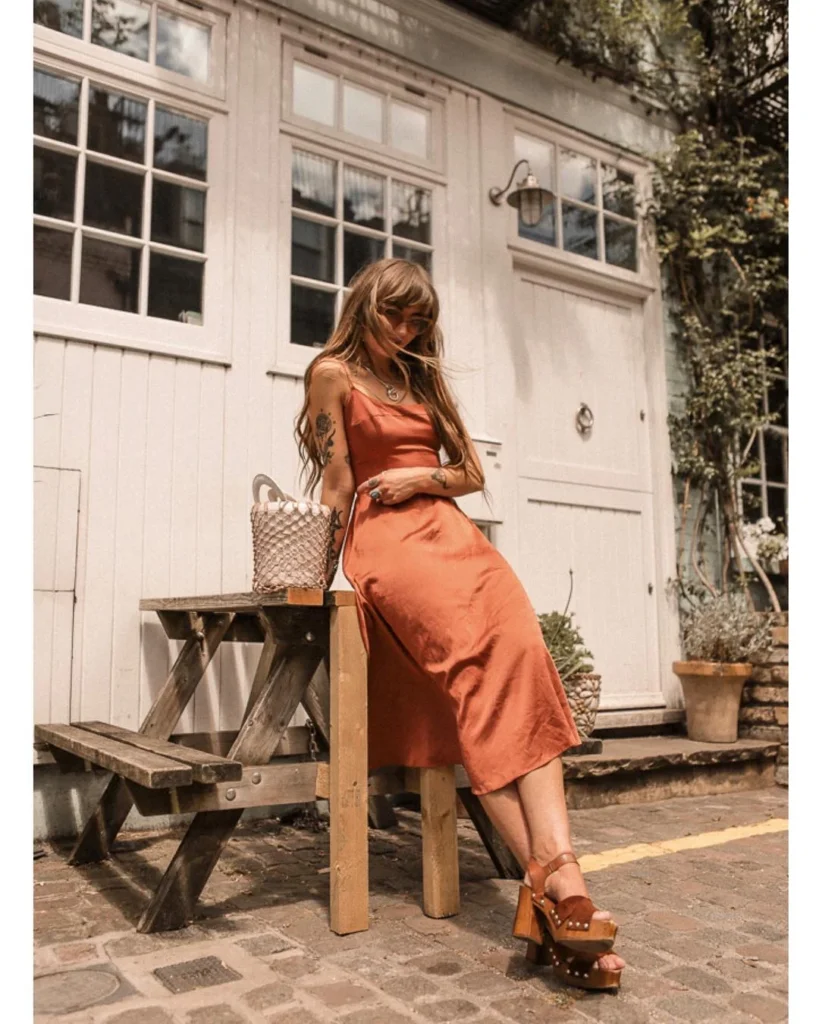 A rust satin midi dress brings a soft, warm charm to any classy dinner outfit. The silky fabric catches the light beautifully, giving the look a gentle glow that feels feminine and relaxed. Wooden platform heels add a touch of boho confidence, lifting the outfit with height and character.
