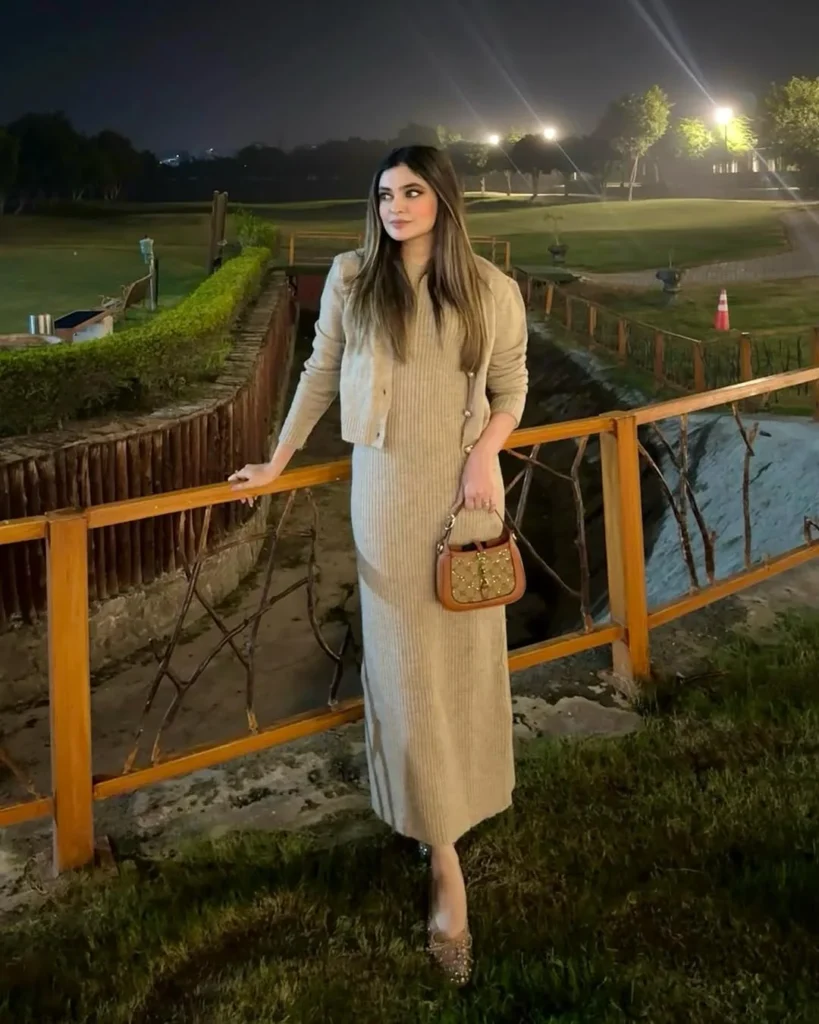 Paired with minimal heels, the outfit feels airy and elegant, making it a lovely choice for a fancy dinner or a rooftop gathering. Her black designer bag adds structure and contrast, grounding the soft tones with a bit of luxury.