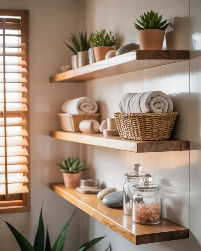 Natural wood floating shelves bring warmth and calm into the bathroom, creating a space that feels relaxed and inviting. Soft sunlight filters through the window, highlighting the wood grain and adding depth to the overall look.