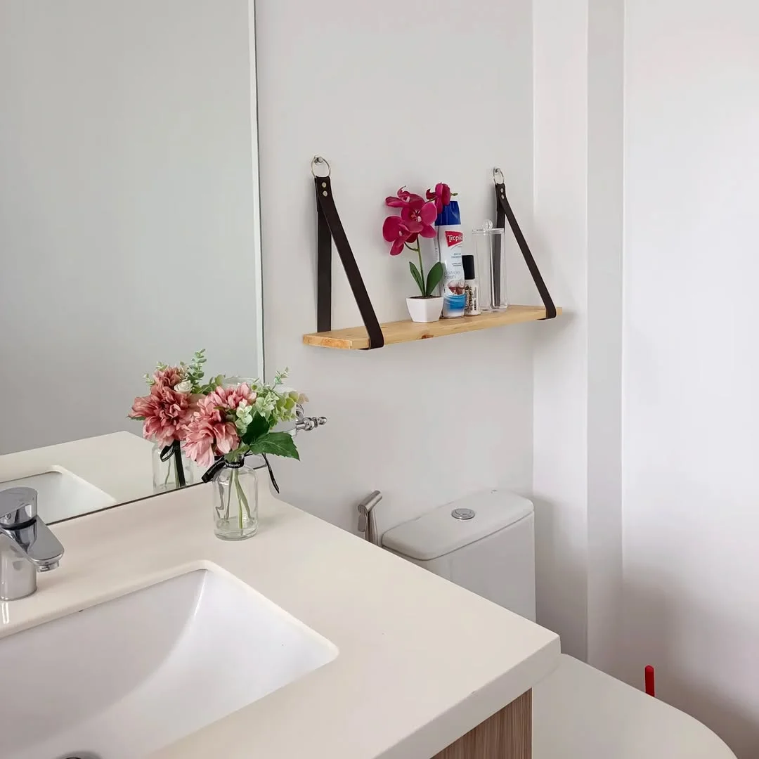 Warm wooden tones soften the clean white vanity and smooth sink edges nearby. Leather straps introduce texture and contrast, giving the shelf a decorative presence rather than a purely storage focused role.