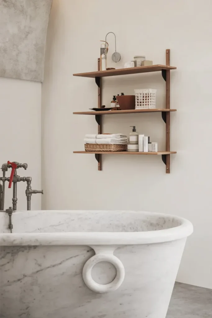 These floating shelves bathroom ideas prove storage can feel decorative and calm. With gentle colors and simple styling, the shelves enhance the room without overwhelming it.