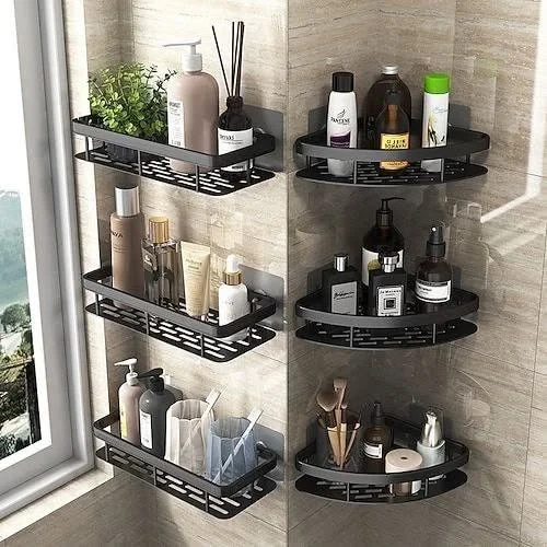 Wall mounted corner shelves turn unused space into smart, organized storage that feels clean and intentional. The black metal design keeps everything visible while preventing bottles and tools from slipping or crowding.
