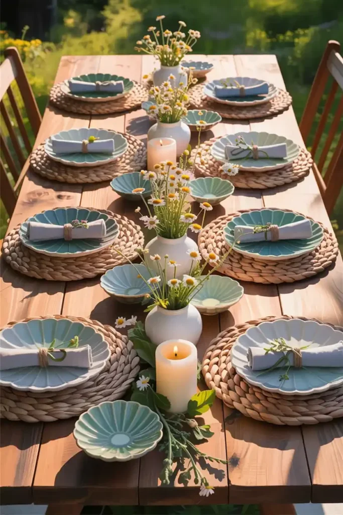 This natural table setting brings the charm of the outdoors to any occasion, combining the earthy elegance of woven placemats with soft, pastel dinnerware. The light blue scalloped plates add a touch of vintage appeal, while the rustic napkins tied with natural twine complement the overall simplicity of the design. Fresh daisies in delicate white vases enhance the fresh, organic feel, and the soft glow of a candle further invites a warm, relaxed ambiance.