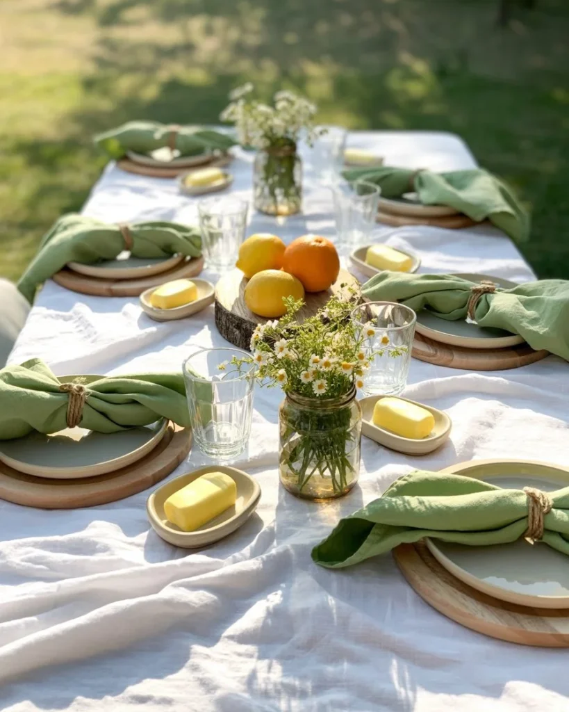 This natural table setting exudes an organic charm, blending soft greenery with vibrant citrus accents. The rustic wooden chargers and earthy beige plates provide a grounding element, while the fresh green napkins tied with twine introduce a natural touch. Simple mason jar vases filled with delicate white flowers bring an airy, fresh vibe, paired beautifully with fresh lemons and oranges that serve as both decor and a burst of color.