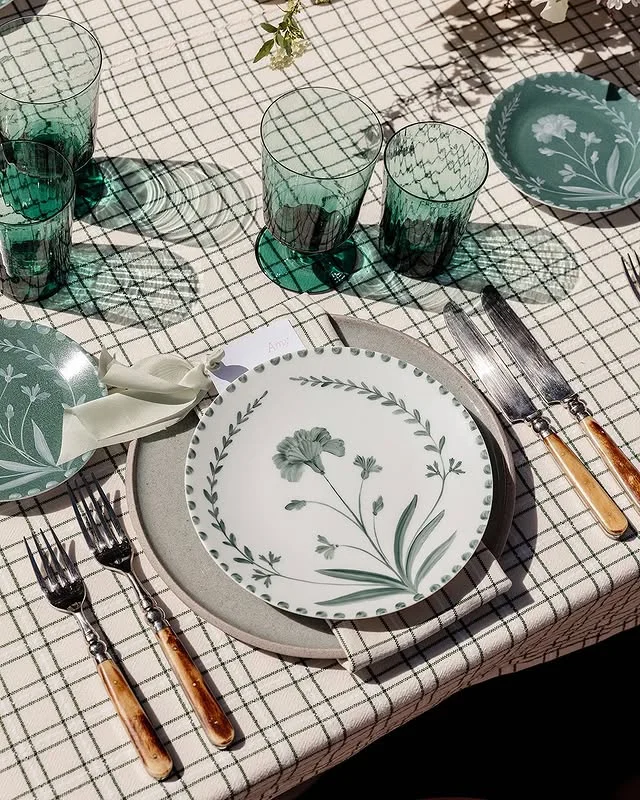 This botanical-inspired table setting brings nature to the forefront with its delicate floral-patterned plates and green tinted glasses. The soft pastel hues of the floral designs add a calming element, while the earthy tones of the ceramic chargers balance the overall aesthetic. A neutral linen napkin, elegantly tied with a ribbon, completes the look, bringing a touch of refinement to the natural elements.